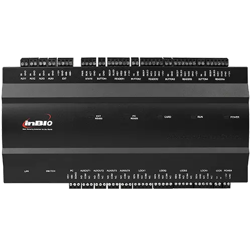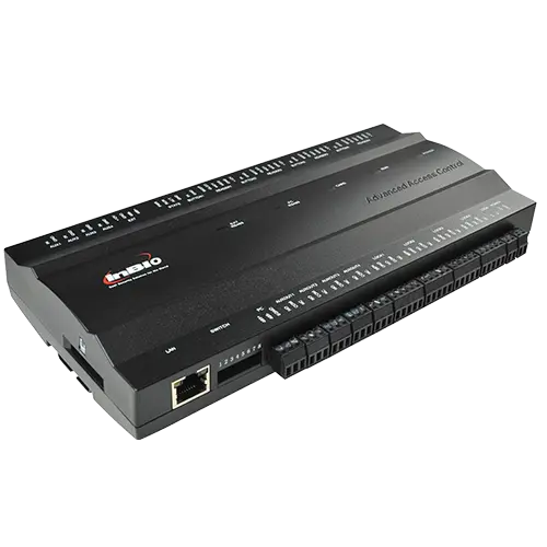 IP-based Biometric Door Access Control Panel for four doors with built-in access control functions and RS485 fingerprint / Wiegand RFID readers support. Communication TCP/IP and RS485. Capacity 3000 fingerprint templates, 30000 cards, 100000 transactions. Support 12 readers.
